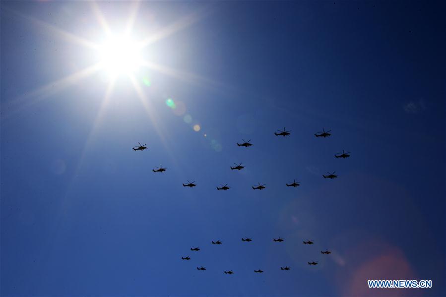 Helicopters fly in the formation of the number "90" symbolizing the epic journey of the People's Liberation Army (PLA) in 90 years during a military parade at Zhurihe training base in north China's Inner Mongolia Autonomous Region, July 30, 2017. China on Sunday kicked off a grand military parade to mark the 90th founding anniversary of the PLA. [Photo/Xinhua] |