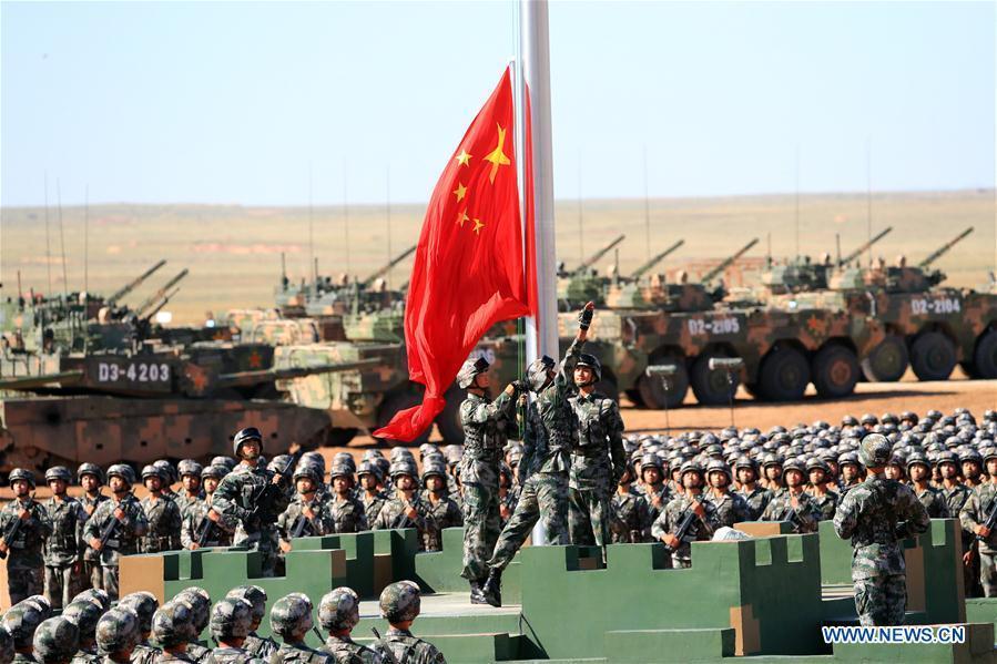 A flag-raising ceremony is held during a military parade celebrating the 90th anniversary of the founding of the Chinese People's Liberation Army (PLA) at Zhurihe training base in north China's Inner Mongolia Autonomous Region, July 30, 2017. Chinese President Xi Jinping, also general secretary of the Communist Party of China Central Committee and chairman of the Central Military Commission, will inspect the troops and deliver an important speech. [Photo/Xinhua]