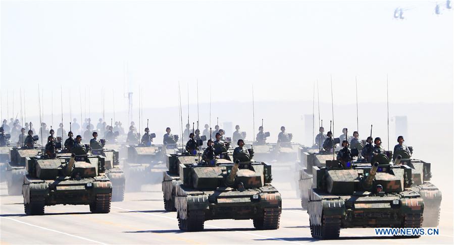 Tanks are reviewed in a military parade at Zhurihe training base in north China's Inner Mongolia Autonomous Region, July 30, 2017. China on Sunday kicked off a grand military parade to mark the 90th founding anniversary of the People's Liberation Army. [Photo/Xinhua] |