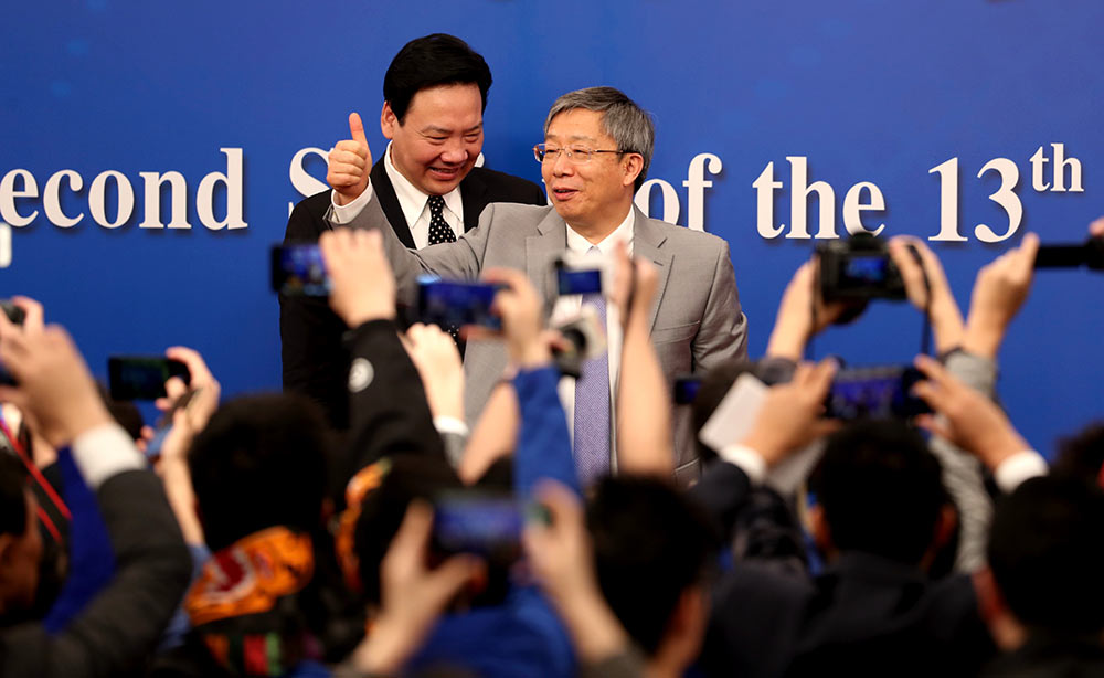 People's Bank of China Governor Yi Gang (center) interacts with reporters after a news conference in Beijing on Sunday as Vice-Governor Chen Yulu passes nearby. [Photo by Feng Yongbin/China Daily]