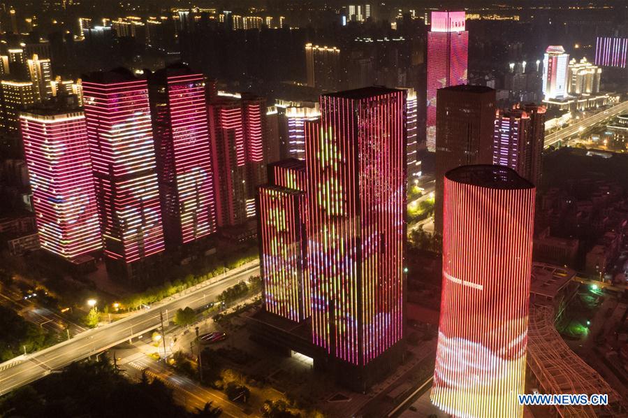 Aerial photo taken on April 8, 2020 shows illuminated buildings in Wuhan, central China's Hubei Province. Wuhan, the megacity in central China, started lifting outbound travel restrictions from Wednesday after almost 11 weeks of lockdown to stem the spread of COVID-19. [Photo/Xinhua]