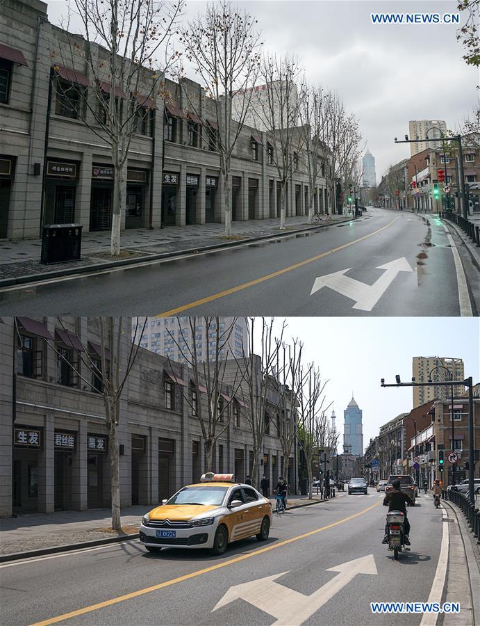 Combo photo shows the Zhongshan Avenue in Wuhan, central China's Hubei Province on Jan. 26, 2020 (upper) and on April 8, 2020. With long lines of cars streaming through expressway tollgates and masked passengers boarding trains, the megacity of Wuhan in central China lifted outbound travel restrictions on Wednesday after almost 11 weeks of lockdown imposed to stem the COVID-19 outbreak. [Photo/Xinhua]