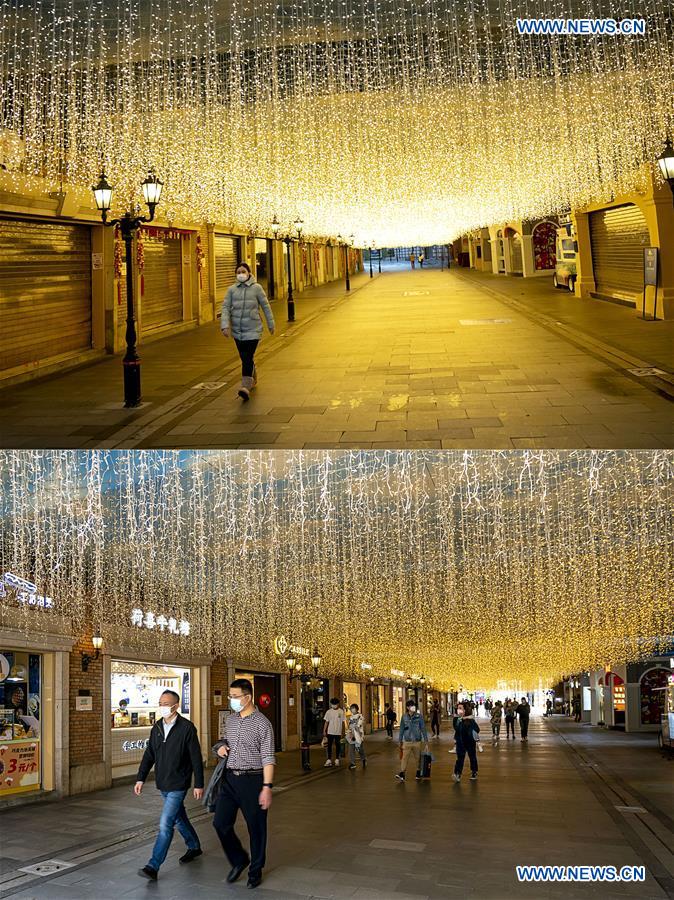 Combo photo shows the view of the Chuhehan Street in Wuhan, central China's Hubei Province on Jan. 26, 2020 (upper) and on April 8, 2020. With long lines of cars streaming through expressway tollgates and masked passengers boarding trains, the megacity of Wuhan in central China lifted outbound travel restrictions on Wednesday after almost 11 weeks of lockdown imposed to stem the COVID-19 outbreak. [Photo/Xinhua]