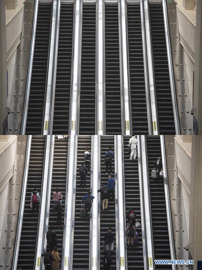 Combo photo shows the view of the entrance hall of the Hankou Railway Station in Wuhan, central China's Hubei Province on April 7, 2020 (upper) and on April 8, 2020. With long lines of cars streaming through expressway tollgates and masked passengers boarding trains, the megacity of Wuhan in central China lifted outbound travel restrictions on Wednesday after almost 11 weeks of lockdown imposed to stem the COVID-19 outbreak. [Photo/Xinhua]