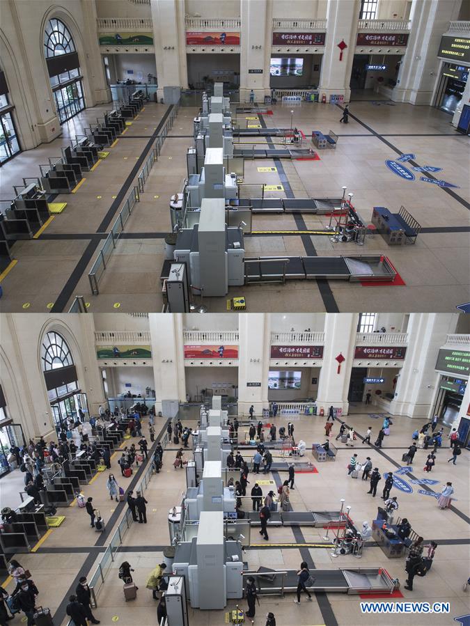 Combo photo shows the view of the entrance hall of the Hankou Railway Station in Wuhan, central China's Hubei Province on April 7, 2020 (upper) and on April 8, 2020. With long lines of cars streaming through expressway tollgates and masked passengers boarding trains, the megacity of Wuhan in central China lifted outbound travel restrictions on Wednesday after almost 11 weeks of lockdown imposed to stem the COVID-19 outbreak. [Photo/Xinhua]