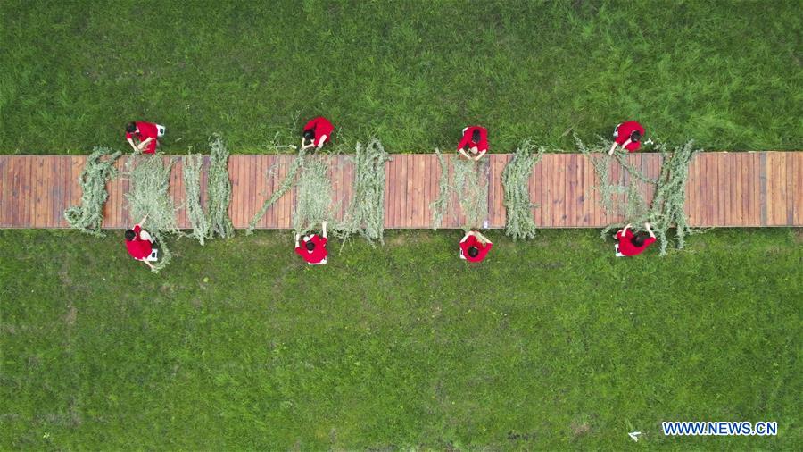 Aerial photo taken on June 25, 2020 shows villagers taking part in a wormwood weaving competition during the Dragon Boat Festival at Huajiaoyuan Village of Zunhua, north China's Hebei Province. The Dragon Boat Festival, also called the Duanwu Festival, is traditionally celebrated on the fifth day of the fifth month on Chinese lunar calendar. It falls on June 25 this year. (Photo by Liu Mancang/Xinhua)