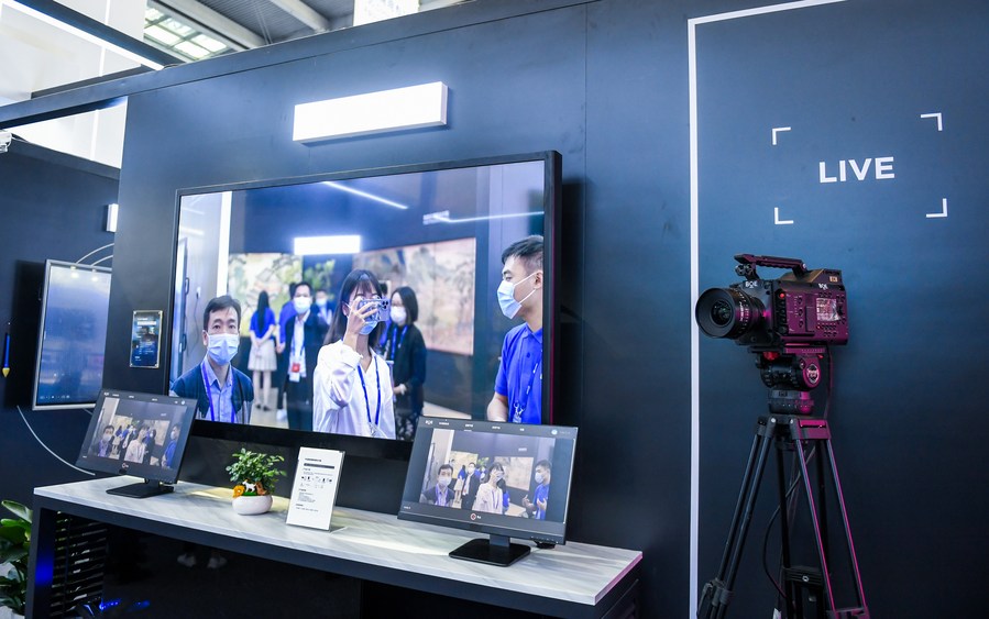 A visitor experiences 8K live streaming via 5G network at the booth of BOE Technology Group Co., Ltd. during the 22nd China Hi-Tech Fair (CHTF) in Shenzhen, south China's Guangdong province, Nov. 11, 2020. [Photo/Xinhua]
