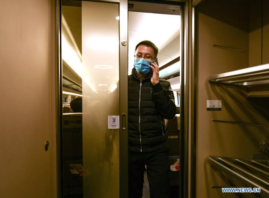 A passenger walks out of the "Quiet Car" to answer the phone on high-speed train G8609 from Chengdu East Railway Station in southwest China's Sichuan Province to Shapingba Railway Station in southwest China's Chongqing on Dec. 24, 2020. [Photo/Xinhua]