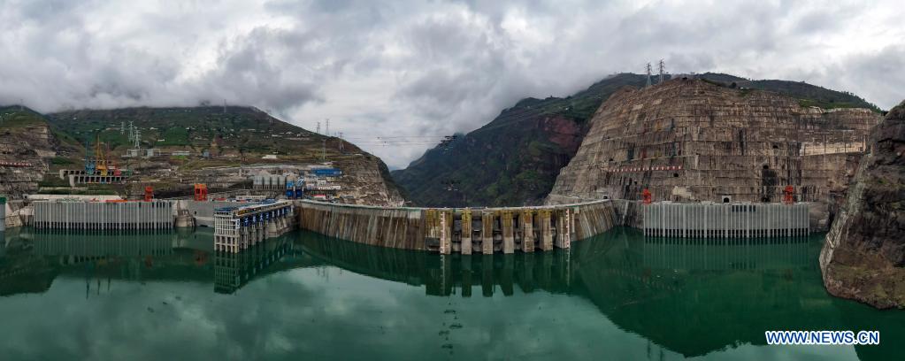 The stitched aerial photo taken on June 28, 2021 shows Baihetan hydropower station in southwest China. Baihetan hydropower station, the world's second largest in terms of total installed capacity, was officially put into use in southwest China, with two generating units in operation on Monday. (Xinhua/Jiang Wenyao)
