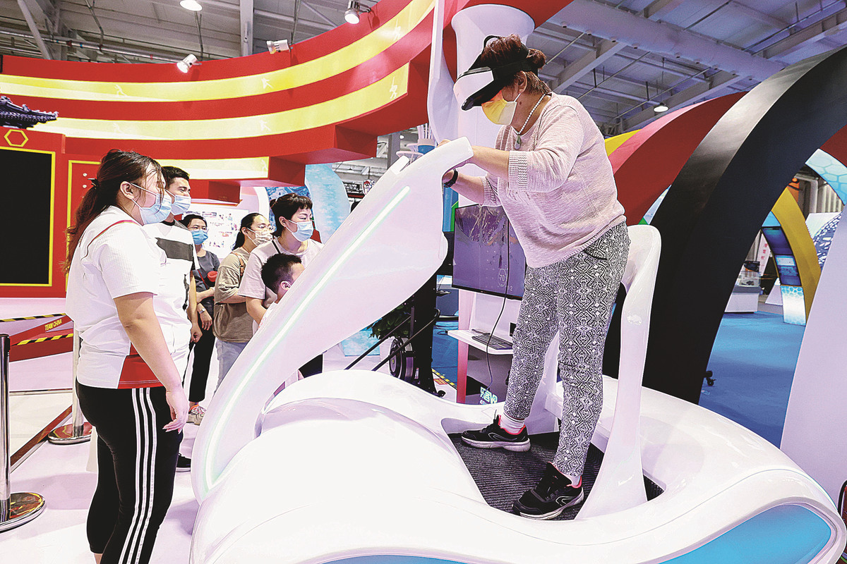 A visitor (right) experiences virtual reality skiing during the 2021 China International Fair for Trade in Services in Beijing on Sept 4. [Photo by Chen Xiaogen/for China Daily]