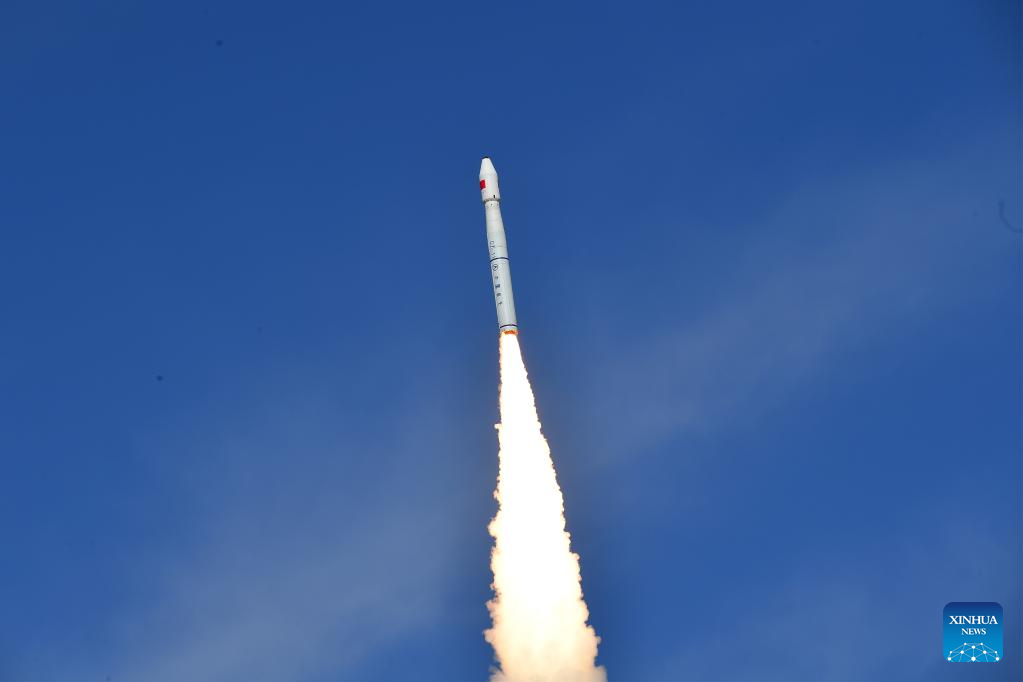 A Long March-11 carrier rocket carrying three satellites blasts off from the Jiuquan Satellite Launch Center in northwest China, March 30, 2022. China has successfully sent three satellites into space from the Jiuquan Satellite Launch Center in northwest China on Wednesday. The three satellites Tianping-2A, Tianping-2B and Tianping-2C will provide services such as atmospheric space environment survey and orbital prediction model correction. (Photo by Wang Jiangbo/Xinhua)
