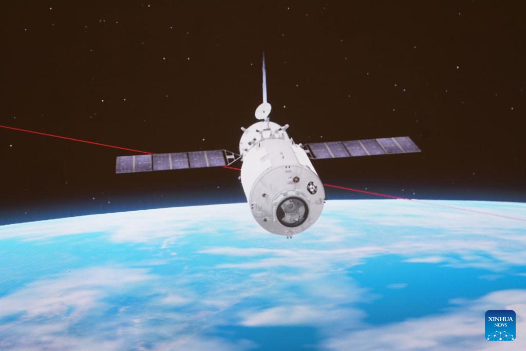 Photo taken at Beijing Aerospace Control Center on March 31, 2022 shows a simulation image of the Tianzhou-2 cargo craft. China's Tianzhou-2 cargo craft entered the Earth's atmosphere under ground control at 6:40 p.m. Beijing Time, the China Manned Space Agency announced on Thursday. Most of the spacecraft burned up during the process, while a small amount of the debris fell into the intended area of safe water in the South Pacific, said the agency. (Xinhua/Guo Zhongzheng)