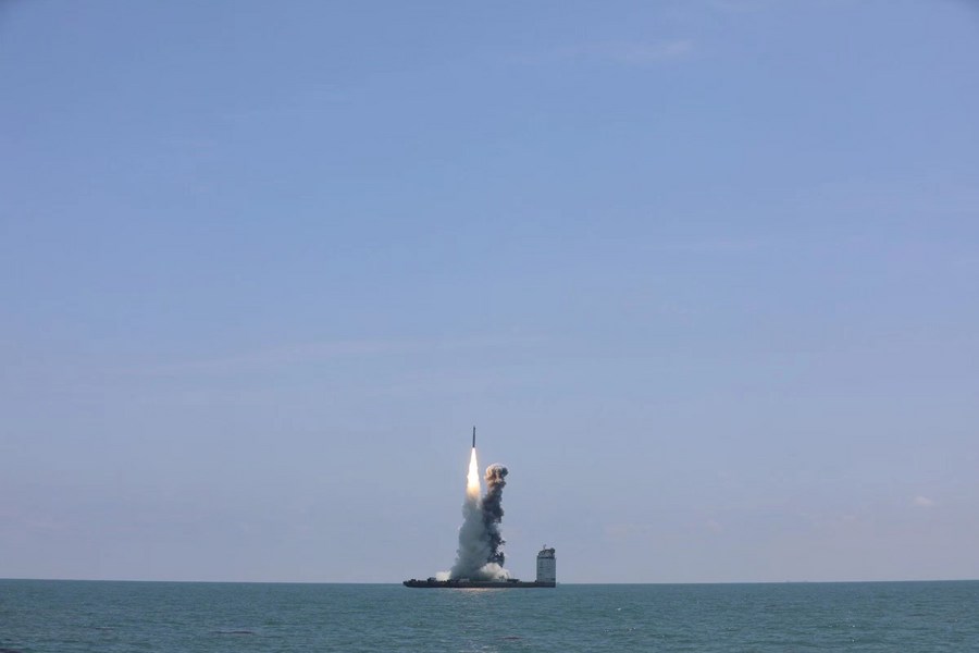 A Long March-11 rocket carrying the Jilin-1 Gaofen series satellites blasts off from a platform in the East China Sea, April 30, 2022. (Xinhua/Yu Jisong)