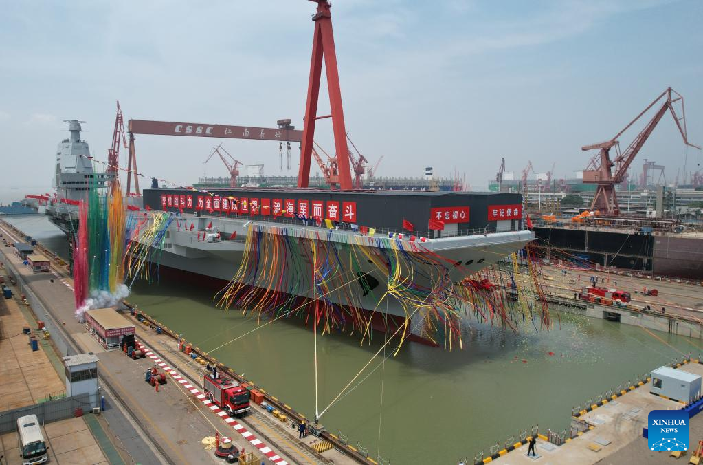Photo taken on June 17, 2022 shows the launching ceremony of China's third aircraft carrier, the Fujian, in east China's Shanghai. The carrier, named after Fujian Province, was completely designed and built by the country. (Xinhua/Li Gang)
