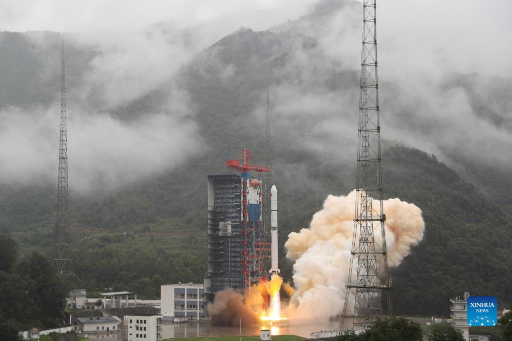 A Long March-2D carrier rocket carrying three new remote sensing satellites blasts off from the Xichang Satellite Launch Center in southwest China's Sichuan Province, June 23, 2022. The satellites were launched as the second batch of the Yaogan-35 family at 10:22 a.m. (Beijing Time) and entered the planned orbit successfully. The satellites will be mainly used to conduct science experiments, land resource surveys, yield estimation of agricultural products and disaster prevention and reduction. (Photo by Qiu Lijun/Xinhua)