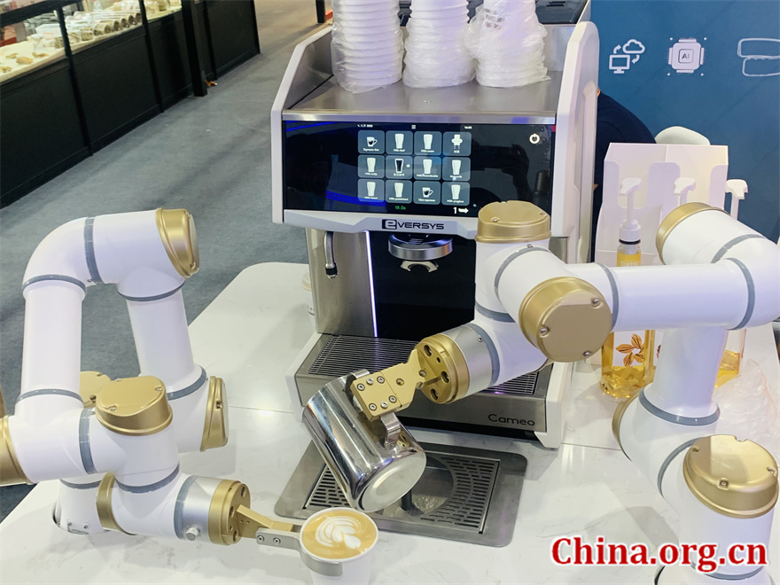 An automated coffer maker makes latte art at the 2022 China International Fair for Trade in Services (CIFTIS) in Beijing on Sept. 1, 2022. [Photo by Liu Jianing/China.org.cn]