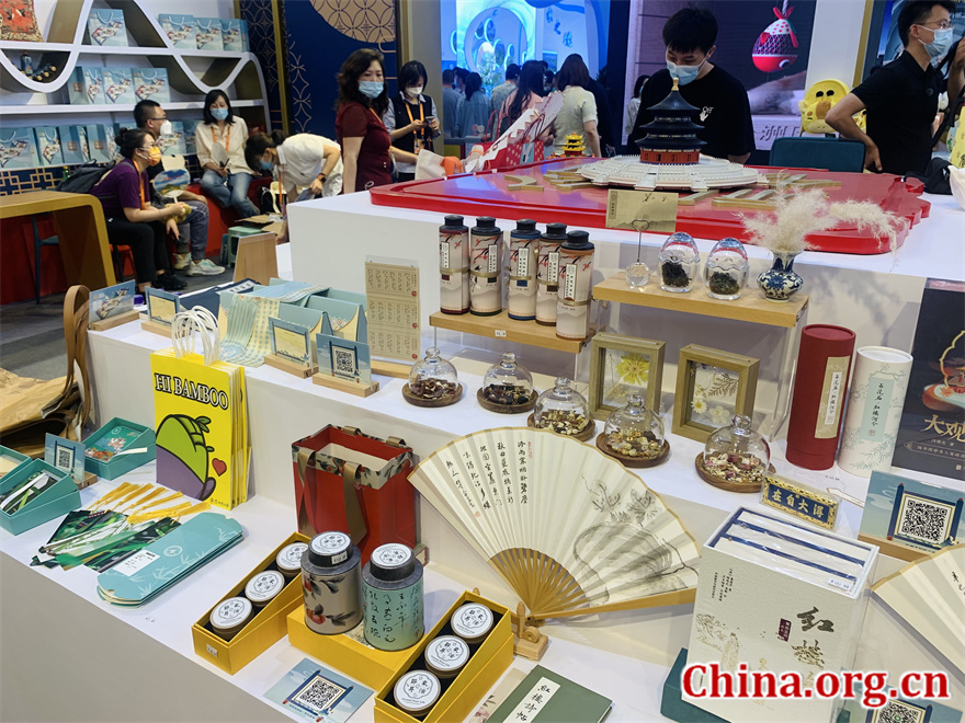 Photo taken on Sept. 1, 2022, shows various cultural products at the 2022 China International Fair for Trade in Services (CIFTIS) in Beijing. [Photo by Liu Jianing/China.org.cn]