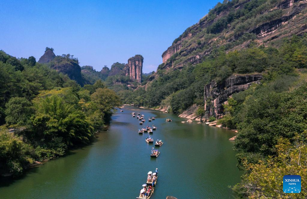 Aerial photo shows people taking bamboo rafts to appreciate scenery during the Mid-Autumn Festival holiday in the Wuyishan National Park, southeast China's Fujian Province, Sept. 11, 2022.