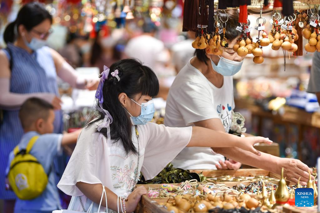 People shop in a souvenir store in Confucius Temple tourist area during the Mid-Autumn Festival holiday in Nanjing, east China's Jiangsu Province, Sept. 11, 2022.