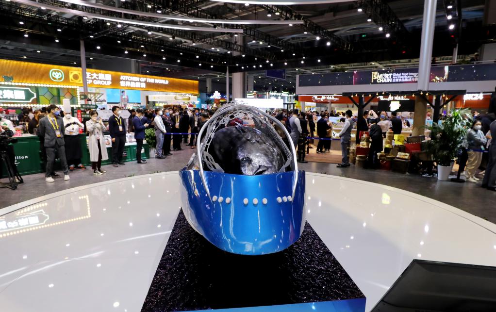 A 370-kilogram bluefin tuna is on display at the food and agricultural products exhibition area of the fifth China International Import Expo (CIIE) at the National Exhibition and Convention Center (Shanghai) in east China's Shanghai, Nov. 6, 2022. (Xinhua/Fang Zhe)