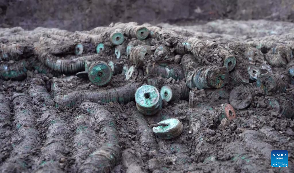Ancient coins are unearthed in Jianhu County, Yancheng City, east China's Jiangsu Province, Oct. 23, 2022. An ancient coin hoard containing 1.5 tonnes of coins dating back to the Tang (618-907) and Song (960-1279) dynasties has been discovered in east China's Jiangsu Province. (Photo/Xinhua)