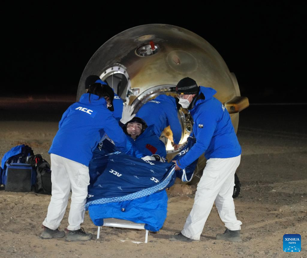 Astronaut Cai Xuzhe is out of the return capsule of the Shenzhou-14 manned spaceship at the Dongfeng landing site in north China's Inner Mongolia Autonomous Region, Dec. 4, 2022. The return capsule of the Shenzhou-14 manned spaceship, carrying astronauts Chen Dong, Liu Yang and Cai Xuzhe, touched down at the Dongfeng landing site safely on Sunday. (Xinhua/Li Gang)