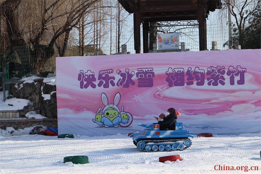 A boy and his grandparent ride on a mini-sized snow tank at Zizhuyuan Park in Beijing, Jan 4, 2023. [Photo by Yan Bin/China.org.cn]
