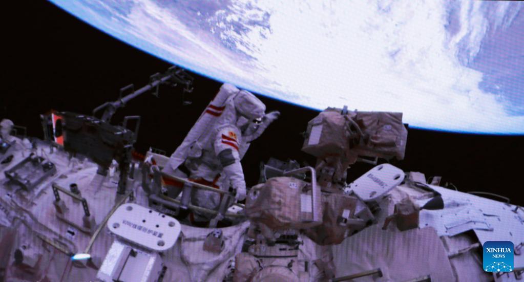 This screen image captured at Beijing Aerospace Control Center on Feb. 9, 2023 shows Shenzhou-15 taikonaut Fei Junlong waving after exiting the space station lab module Wentian. The Shenzhou-15 taikonauts on board the orbiting Chinese Tiangong space station completed their first spacewalk at 12:16 a.m. (Beijing Time) on Friday, according to the China Manned Space Agency. (Xinhua/Liu Fang)