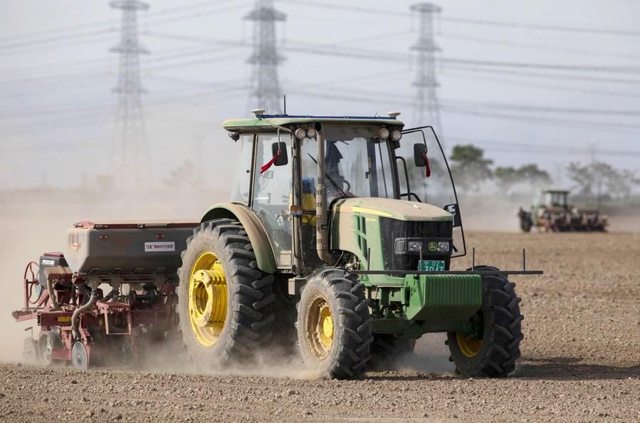 Photo taken on May 27, 2022 shows farming machines equipped with BeiDou Navigation Satellite System working at an unmanned farm in northwest China's Ningxia Hui Autonomous Region. (Xinhua/Yang Zhisen)