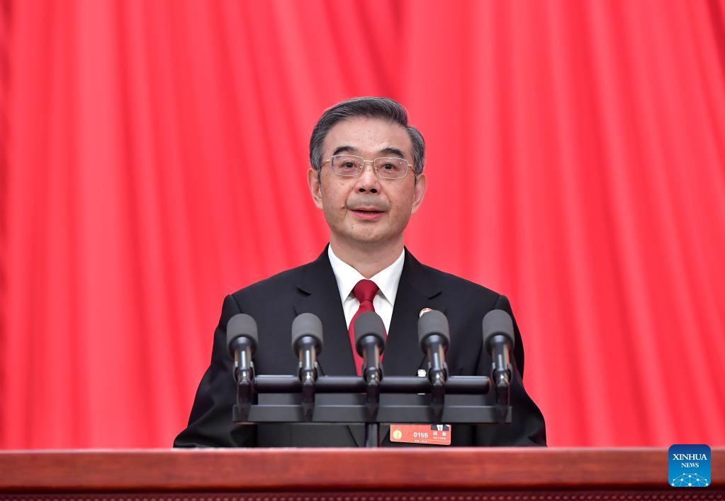Zhang Jun, procurator-general of the Supreme People's Procuratorate (SPP), delivers a work report of the SPP at the second plenary meeting of the first session of the 14th National People's Congress (NPC) at the Great Hall of the People in Beijing, capital of China, March 7, 2023. (Xinhua/Yan Yan)