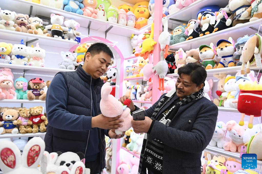 An Indian businessman (R) shops at the Yiwu International Trade Market in Yiwu City, east China's Zhejiang Province, Feb. 2, 2023. (Xinhua/Huang Zongzhi)