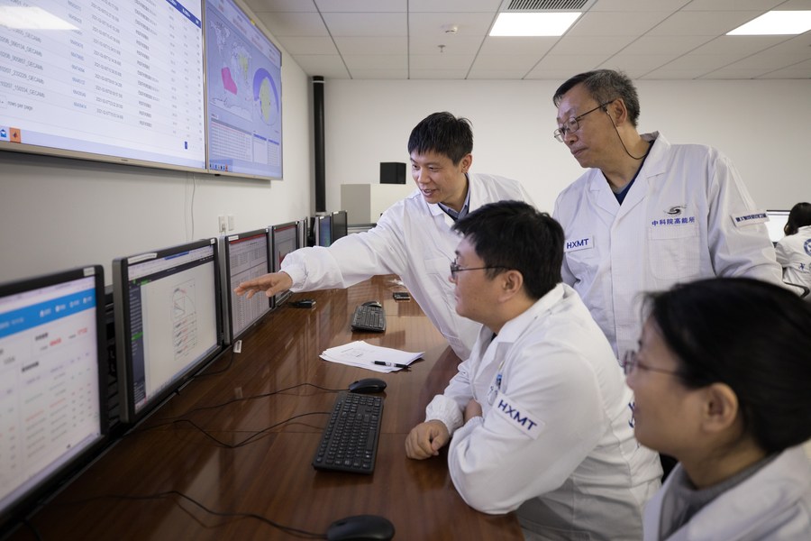 Zhang Shuangnan (3rd L), lead scientist of China's Hard X-ray Modulation Telescope (HXMT), works with his colleagues Xiong Shaolin (1st L) and Li Chengkui (2nd L) at the Institute of High Energy Physics under the Chinese Academy of Sciences in Beijing, capital of China, Feb. 18, 2021. (Xinhua/Jin Liwang)