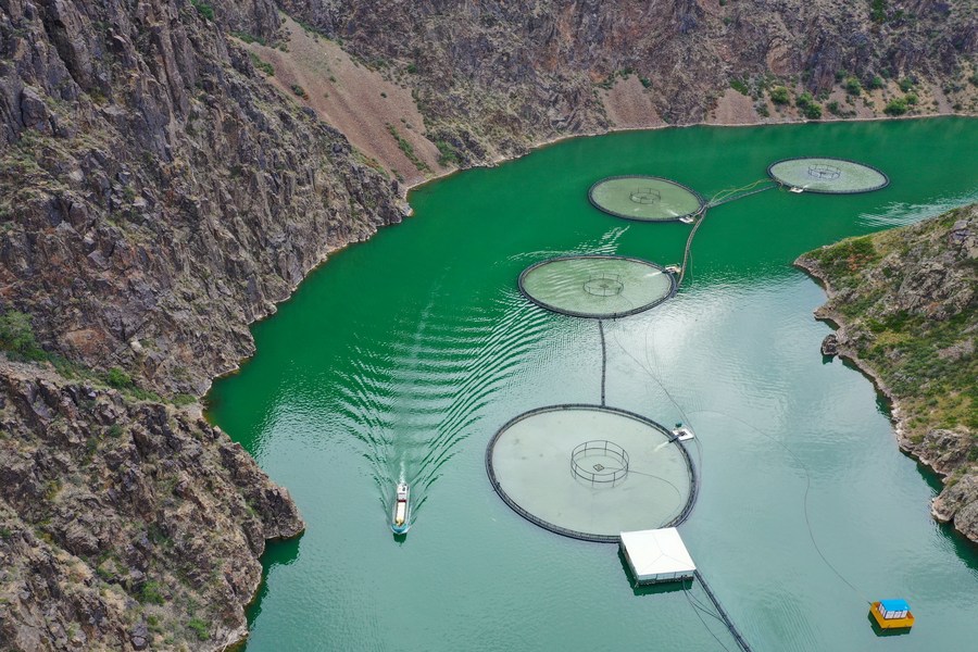 Aerial photo taken on June 17, 2021 shows a transport ship carrying freshly caught cold-water fish at a cold-water fish breeding base in Karasu, Nilka County, northwest China's Xinjiang Uygur Autonomous Region. (Xinhua/Ding Lei)