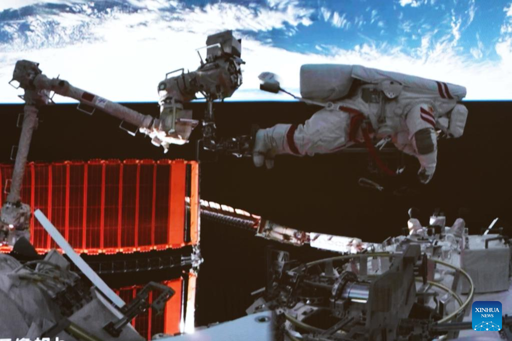 This screen image captured at Beijing Aerospace Control Center on April 15, 2023 shows Shenzhou-15 taikonaut Fei Junlong performing extravehicular activities outside the Wentian lab module. The Shenzhou-15 taikonauts on board the orbiting Chinese Tiangong space station have completed their fourth spacewalk, the China Manned Space Agency said on Sunday. (Xinhua/Guo Zhongzheng)