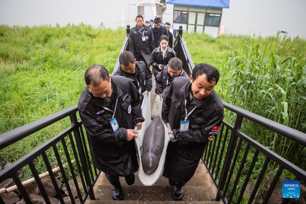 Staff members carry a Yangtze finless porpoise to a transportation vehicle in central China's Hubei Province, April 25, 2023. (Xinhua/Wu Zhizun)