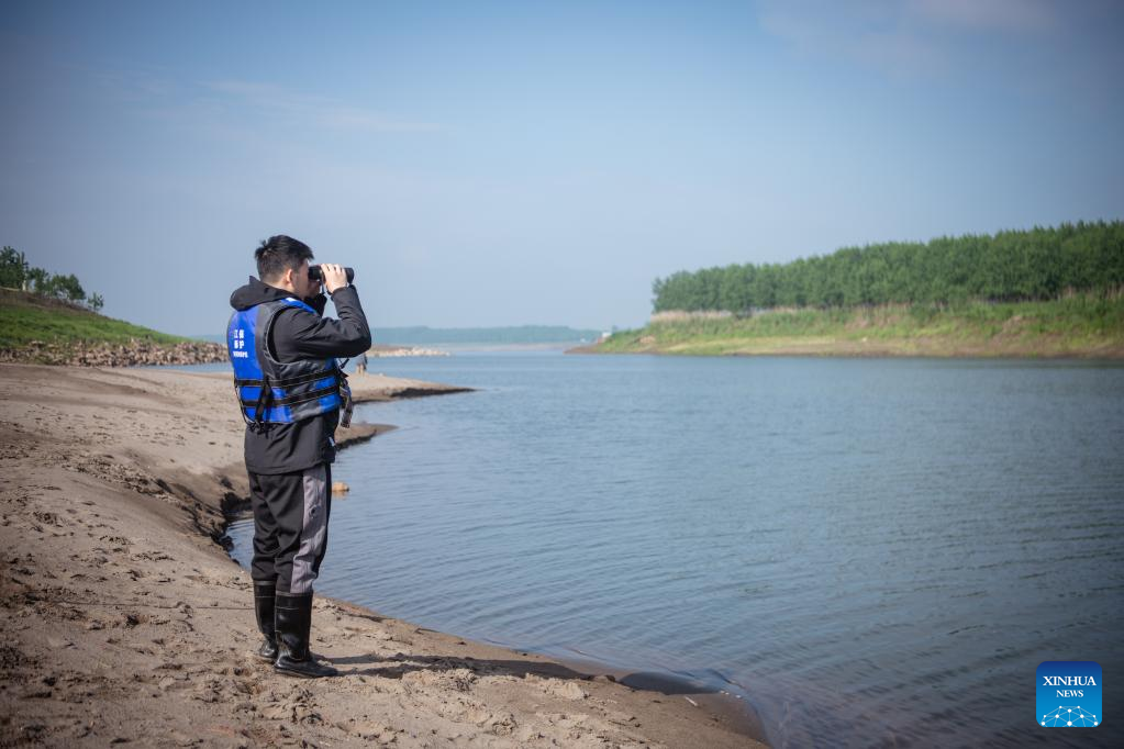 A staff member monitors the condition of released Yangtze finless porpoises on the bank of the Yangtze river in central China's Hubei Province, April 25, 2023. (Xinhua/Wu Zhizun)