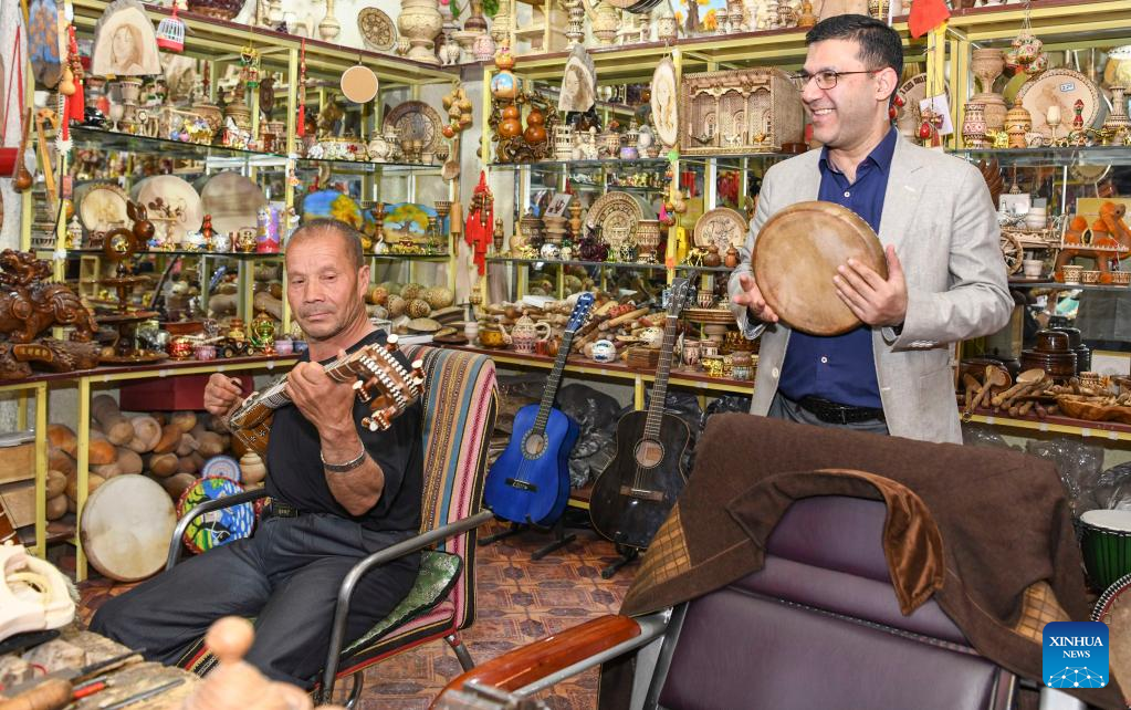 Hossein Darvishi (R), Iranian consul general in Guangzhou, plays hand drum while visiting a musical instrument store in the old town of Kashgar, northwest China's Xinjiang Uygur Autonomous Region, April 24, 2023. Envoys from 14 countries, including Brazil, Iran, Indonesia, Pakistan, Ecuador and Senegal, visited northwest China's Xinjiang Uygur Autonomous Region from April 24 to 28 at the invitation of China's Ministry of Foreign Affairs. (Xinhua/Hu Huhu)