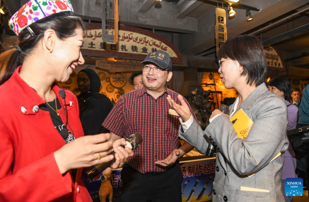 Ben Perkasa Drajat (C), Indonesian consul general in Guangzhou, talks with a local tour guide (L) while visiting a bazzar in the old town of Kashgar, northwest China's Xinjiang Uygur Autonomous Region, April 24, 2023. Envoys from 14 countries, including Brazil, Iran, Indonesia, Pakistan, Ecuador and Senegal, visited northwest China's Xinjiang Uygur Autonomous Region from April 24 to 28 at the invitation of China's Ministry of Foreign Affairs. (Xinhua/Hu Huhu)