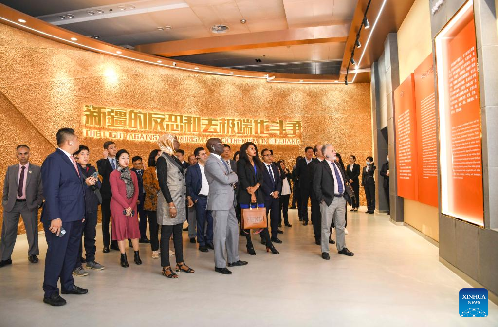 Foreign envoys visit an exhibition on the fight against terrorism and extremism in Xinjiang, in Urumqi, northwest China's Xinjiang Uygur Autonomous Region, April 27, 2023. Envoys from 14 countries, including Brazil, Iran, Indonesia, Pakistan, Ecuador and Senegal, visited northwest China's Xinjiang Uygur Autonomous Region from April 24 to 28 at the invitation of China's Ministry of Foreign Affairs. (Xinhua/Hu Huhu)