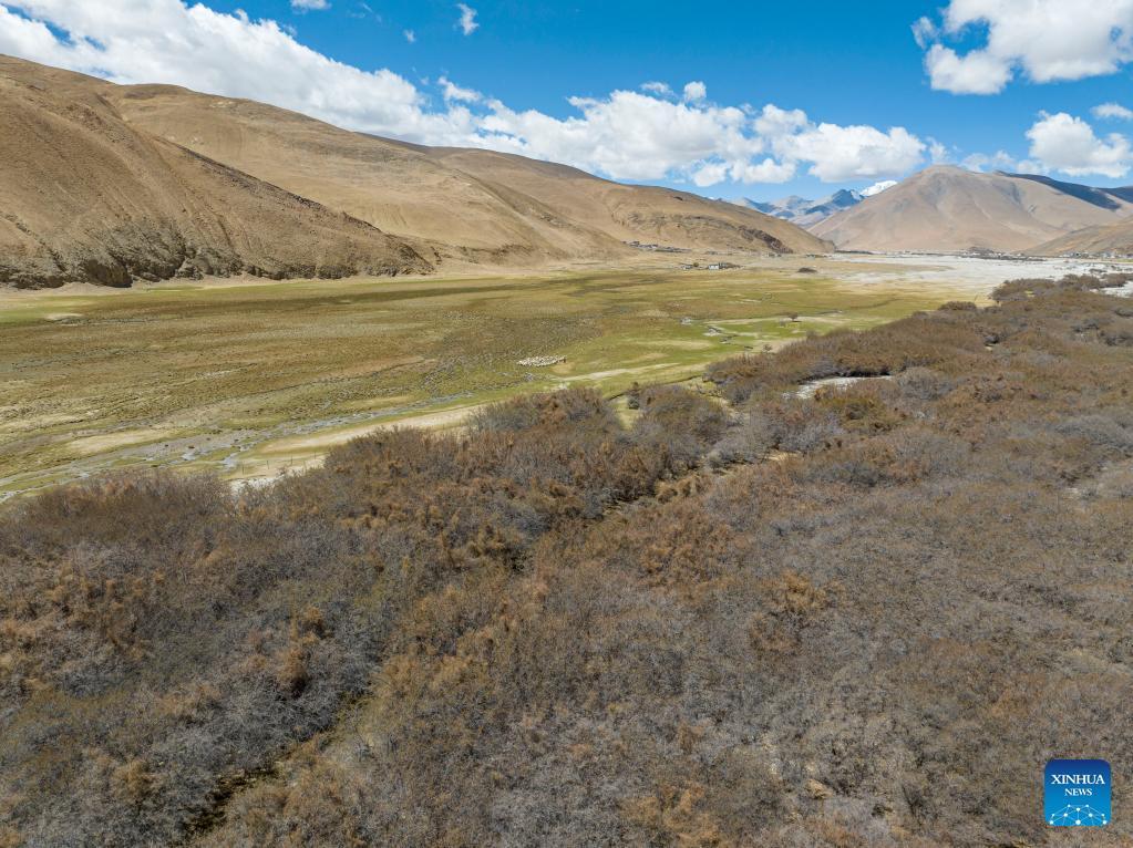This aerial photo taken on May 25, 2023 shows a seabuckthorn forest and wetlands in Qomolangma National Nature Reserve, southwest China's Tibet Autonomous Region. The ecology of the Mount Qomolangma region continues to improve, as China has made progress in ecological and environmental protection over the years, experts have said as scientific research on the world's highest peak continues. (Xinhua/Sun Fei)