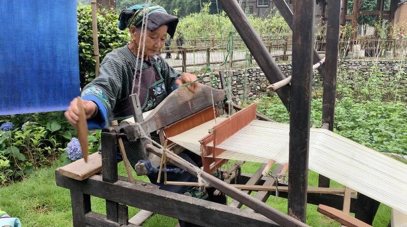 A woman of the Miao ethnic group weaves clothes in Zhonghuang village, Aizhai town, Jishou city, central China's Hunan province, on June 4, 2023. Established during the Qing dynasty (1644-1911), Zhonghuang village preserves a rich history of folk culture and art, including Miao embroidery, cloth weaving, paper making, and oil pressing. [Photo by Liu Jianing/China.org.cn]