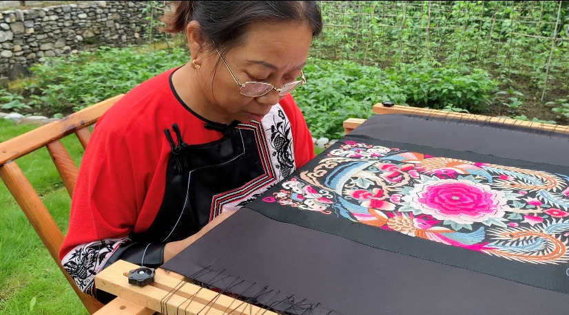 A woman of the Miao ethnic group makes Miao embroidery in Zhonghuang village, Aizhai town, Jishou city, central China's Hubei province, on June 4, 2023. Established during the Qing dynasty (1644-1911), Zhonghuang village preserves a rich history of folk culture and art, including Miao embroidery, cloth weaving, paper making, and oil pressing. [Photo by Liu Jianing/China.org.cn]