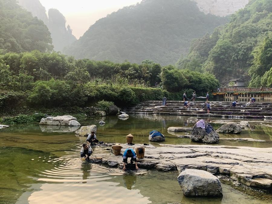 Women of the Miao ethnic group wash clothes in a stream in Dehang Miao village, Jishou city, central China's Hubei province, on June 4, 2023. The village boasts stunning karst landscapes and a network of streams crisscrossing the surrounding region. In the Miao language, "dehang" means "beautiful valley." [Photo by Liu Jianing/China.org.cn]