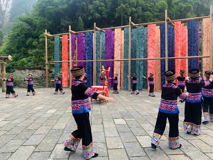 Miao ethnic women perform the Baishou Dance in Dehang Miao village, Jishou city, central China's Hubei province, on June 4, 2023. The Baishou Dance, or hand-waving dance, is deeply rooted in Miao ethnic culture and regarded as one of the most traditional folk dances in China, with a history of 500 years. [Photo by Liu Jianing/China.org.cn]