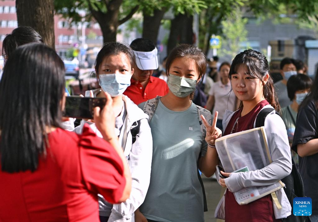 Examinees pose for a group photo outside an exam site at the Experimental High School Attached to Beijing Normal University in Beijing, capital of China, June 7, 2023. China's national college entrance exam, also known as "Gaokao", started Wednesday this year. (Xinhua/Li Xin)