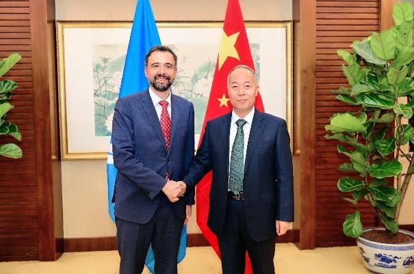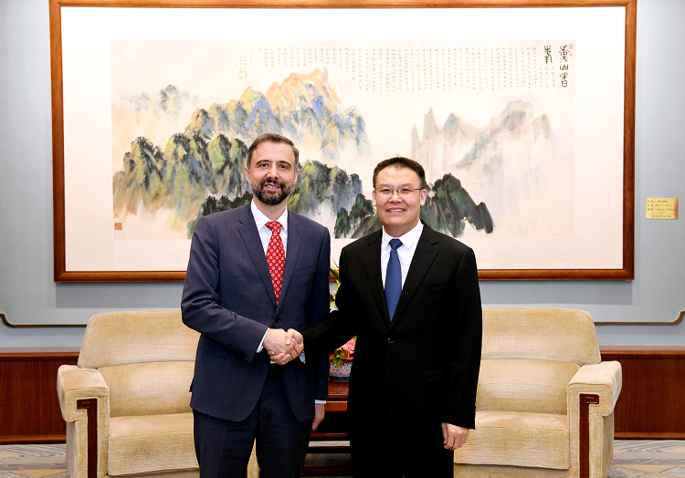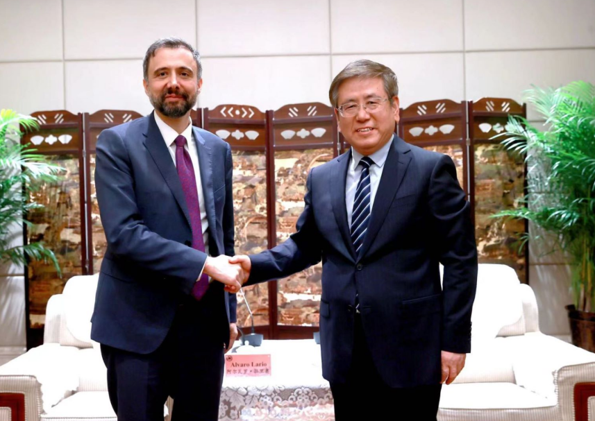 Alvaro Lario (L), President of the UN's International Fund for Agricultural Development, holds a meeting with Luo Zhaohui (R), Chairman of the China International Development Cooperation Agency, June 6, 2023. [Photo by Liu Tao/IFAD China Office]
