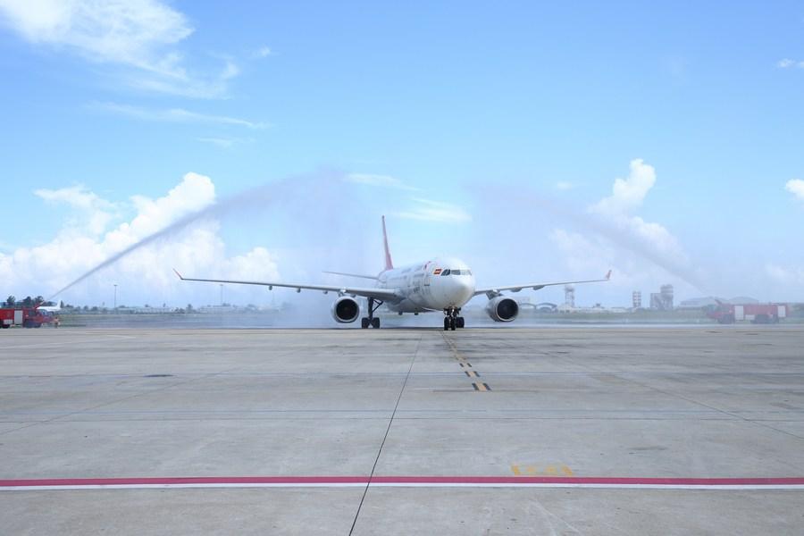 China's Capital Airlines' flight JD455 is welcomed with a water cannon salute at the Velana International Airport in Male, Maldives, Jan. 18, 2023. (Xinhua/Che Hongliang)