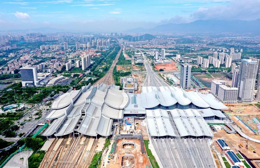 This aerial photo taken on June 19, 2023 shows the newly built part of Xiamen North Railway Station on the Fuzhou-Xiamen high-speed railway in Xiamen, Fujian Province. (Xinhua/Wei Peiquan)