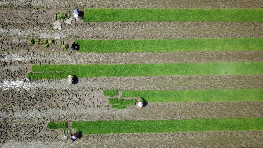 This aerial photo taken on April 26, 2023 shows farmers working in farmland in Yijianhe Village of Yuhu District, Xiangtan City, central China's Hunan Province. (Xinhua/Chen Zeguo)