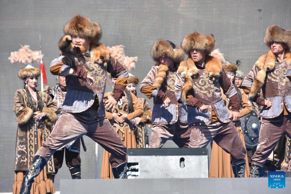 Artists perform the "Manas" epic at the opening ceremony of the ninth Manas international cultural tourism festival in Wuqia County, Kizilsu Kirgiz Autonomous Prefecture in northwest China's Xinjiang Uygur Autonomous Region, July 13, 2023. (Xinhua/Ma Jiashuai)